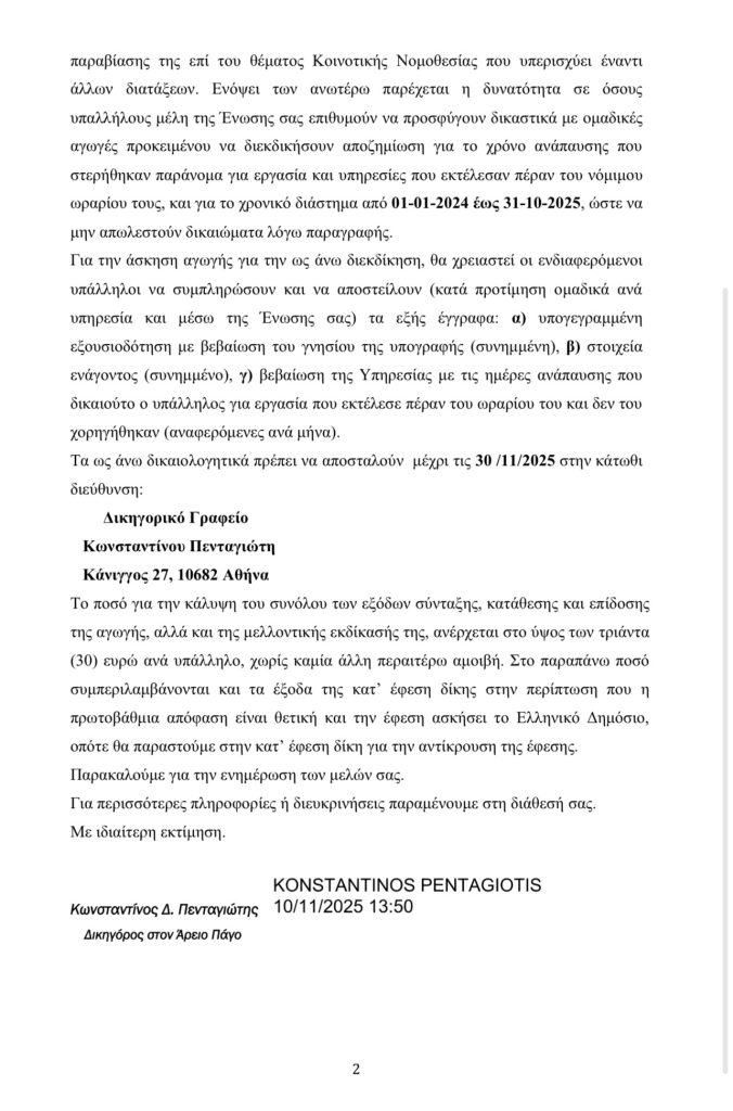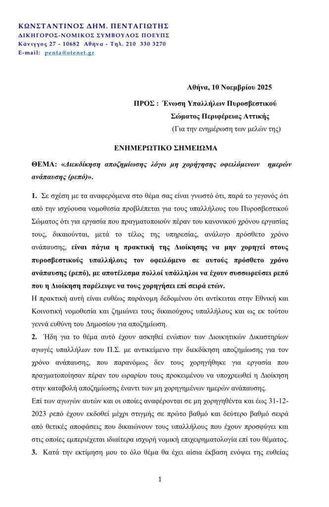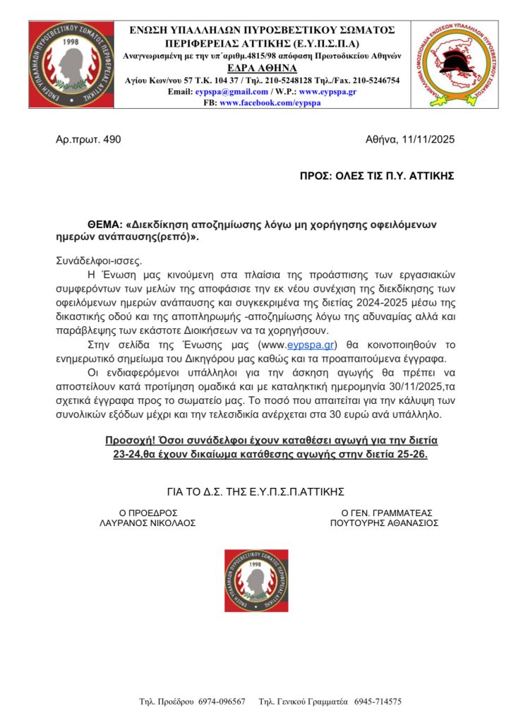 Ενημέρωση σχετικά με τη δικαστική διεκδίκηση αποζημίωσης λόγω μη χορήγησης οφειλόμενων ημερών ανάπαυσης (2024-2025) σε πυροσβεστικούς υπαλλήλους.